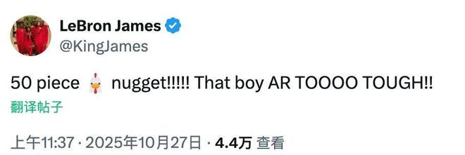 发推称赞了里夫斯,他写道:“50分啊!!!!这孩子太强了!!”